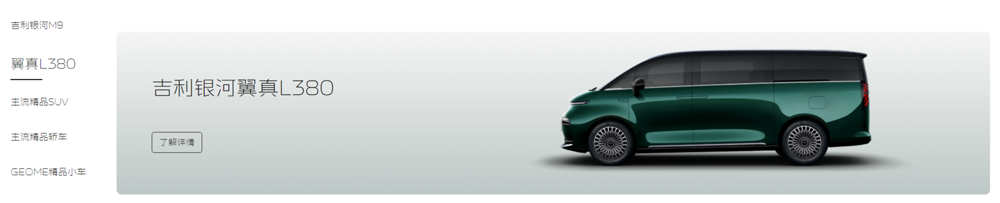 吉利银河旗下目前还有一款翼真 L380 MPV,系列该车采用四排八座设计,首款首秀拥有 800km+ CLTC 纯电续航,车型不过车标为翼真车标,而非吉利银河车标。