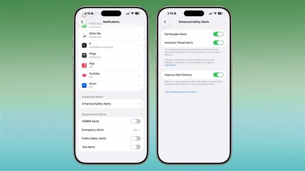 增强安全警报:设置-通知中新增该模块,支持管理“地震警报、紧急威胁警报”,并可开启“位置优化警报推送”,提升警报可靠性。